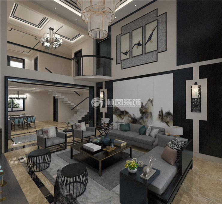 (圖為新中式風(fēng)格躍層別墅裝修效果圖)
