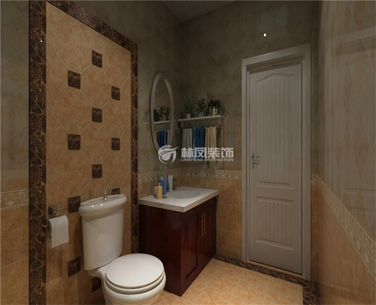 對(duì)于一個(gè)面積不大的衛(wèi)生間,浴室柜上方采用了一個(gè)小圓鏡子的搭配,節(jié)省空間,彰顯個(gè)性,馬桶后方采用了瓷磚拼花的造型凸顯墻面空間的立體,小小的衛(wèi)生間空間感一下就凸顯出來。