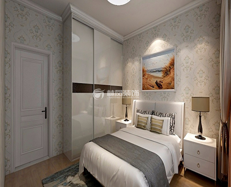 主臥室說(shuō)明:主臥室墻面整體采用偏暖色的壁紙,床頭背景墻的石膏線造型增加了空間的層次。