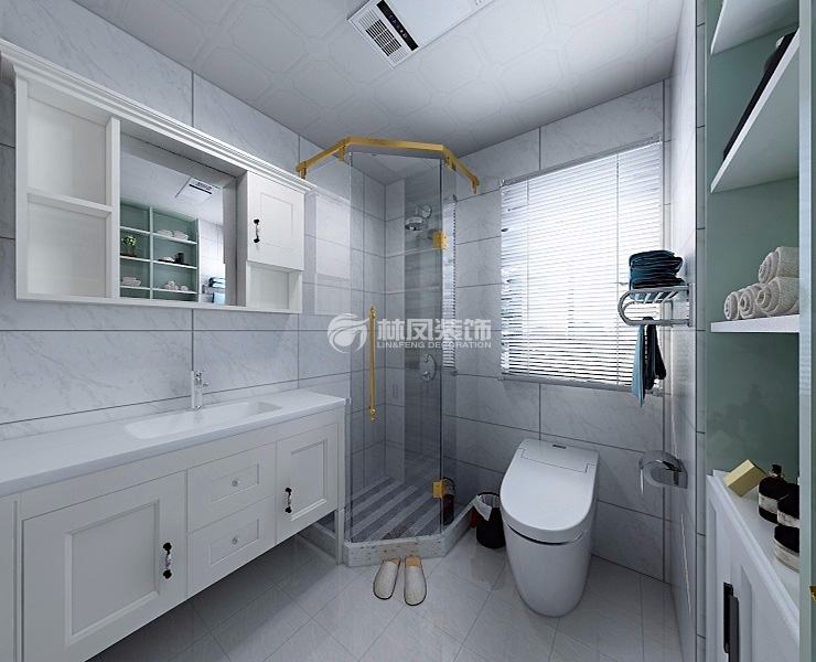 衛(wèi)生間整體為冷色調(diào),為了避免后期衛(wèi)生間的衛(wèi)生打掃時(shí)的不便所以采用的是干濕分離的設(shè)計(jì)方式,兩組通頂?shù)姆胖霉窨梢越鉀Q業(yè)主大部分的雜物收納。