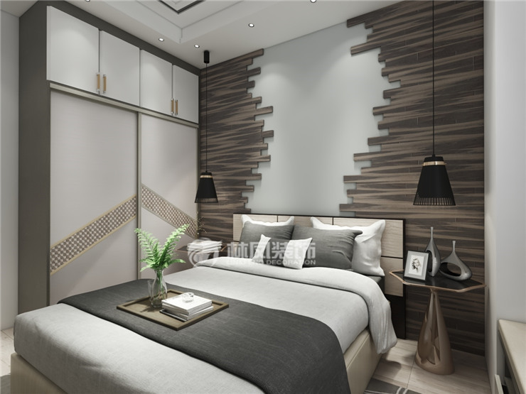 主臥室:在臥室方面我們極力想要營造出時尚與科技感,床頭背景畫采用極簡的黑白色進行色彩碰撞。用簡約的線條和虛光燈帶搭配出時尚感,使用大幅畫作線條體現(xiàn)出它的時尚與不同。