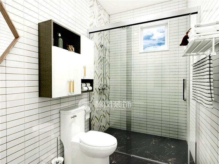 由于衛(wèi)生間內部結構比較局促進而我們在設計當中大膽使用白色進行環(huán)境烘培與地面的黑色產生強烈的視覺碰撞,使得整個空間顯得更加前衛(wèi)大氣。