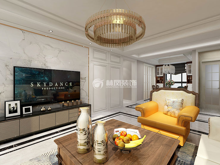 中??党?30平3居室美式風(fēng)格林鳳裝飾的客廳區(qū)域設(shè)計(jì)上運(yùn)用大理石紋理搭配金屬條的搭配,沙發(fā)背景墻上則設(shè)計(jì)墻板與金色金屬條結(jié)合,使空間充滿設(shè)計(jì)感。在軟裝設(shè)計(jì)上搭配白色與黃色搭配的沙發(fā)層次分明,搭配一些精致的軟飾和小擺件、金屬吊燈。