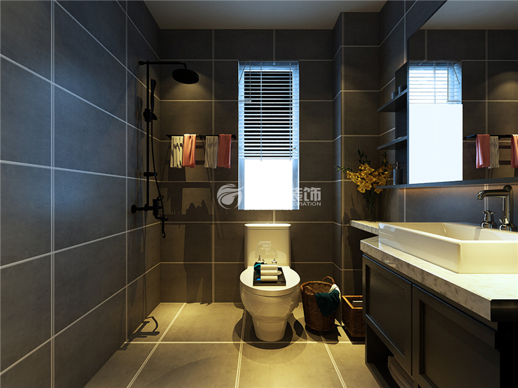 保利達翠提灣79平2居室工業(yè)風林鳳裝飾的衛(wèi)生間深灰的磚大氣不失簡約,白色的美縫顯得整體更為立體。簡單的衛(wèi)浴配飾。使得空間更加大方。大大的鏡子能達到擴大空間的效果。達到理想的空間效果。