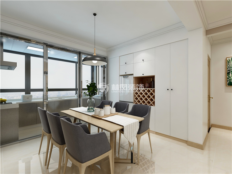 首創(chuàng)國際城112平3居室現(xiàn)代風(fēng)格林鳳裝飾的餐廳位置利用墻體做酒柜,面板顏色與餐桌材質(zhì)相同,整體感強(qiáng)烈,整個(gè)餐廳空間在燈光的渲染下更有溫馨的感覺。