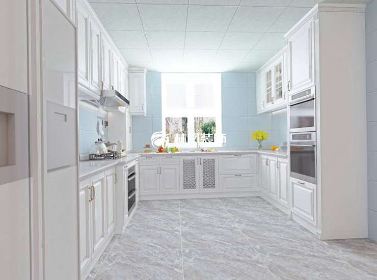 銀河麗灣260平4居室地中海風(fēng)格林鳳裝飾的廚房的面積較大,因?yàn)閷⑼鈮Υ蜷_,增加了儲(chǔ)物空間,因此做U型櫥柜。做了兩面吊柜增加儲(chǔ)物空間。