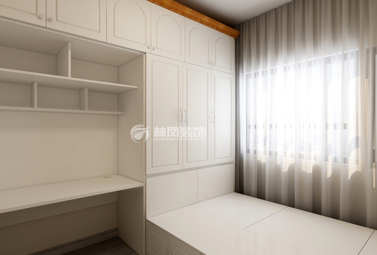 【主臥室說明】主臥的空間相對來說空間比較大一些,墻面以淡黃色為主,床頭背景墻也搭配了石膏線的造型使得空間不顯得空曠?!敬闻P室說明】次臥的空間采用的是定制榻榻米加上連體的書桌裝飾隔板,滿足儲物空間的同時也可以在來客人時作為臥室使用。