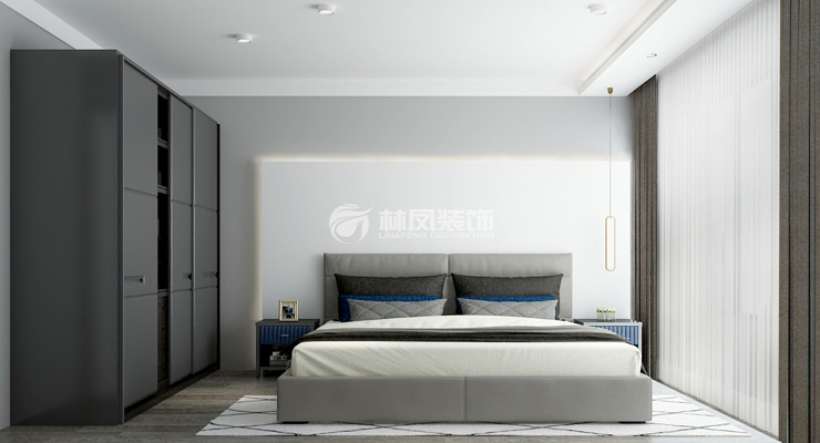 良城美景97平3居室現(xiàn)代風(fēng)格林鳳裝飾的臥室整體墻面延續(xù)客廳的淺灰色乳膠漆,床頭背景墻用石膏板做了凸起造型,并藏有虛光燈帶作為輔助光源,營(yíng)造極其溫馨的臥室氛圍。照明的選擇摒棄了壓抑的主燈,取而代之的是明裝筒燈,并且分兩路做了雙控,使臥室光源富有變化。