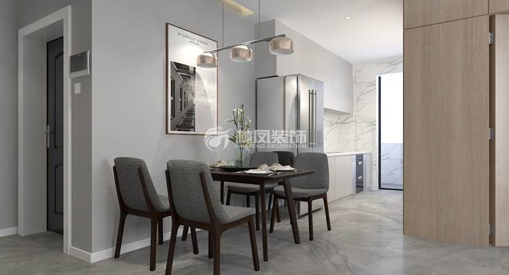 良城美景97平3居室現(xiàn)代風(fēng)格林鳳裝飾的餐廳餐桌深木色家具與客廳相呼應(yīng),餐廳的棚頂與廚房棚頂一體平棚,加強(qiáng)空間延伸感,沒有了阻擋,空間顯得更加開闊。色系加深,突出餐廳的主體地位。