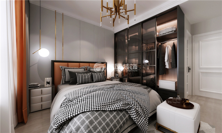 龍湖西府原著125平2居室現(xiàn)代風(fēng)格林鳳裝飾的臥室采用暖色的窗簾配搭床頭貫穿的愛馬仕橙色,背景護(hù)墻板設(shè)計(jì)為米灰色,和橙色對(duì)比壓低了,房主很喜歡透明柜體的設(shè)計(jì),每每打開柜門燈都自動(dòng)感應(yīng)亮的感覺,一向很追求生活平時(shí)的房主選擇燈的時(shí)候也和背景配搭選擇了一款金屬質(zhì)感很強(qiáng)的吊燈。