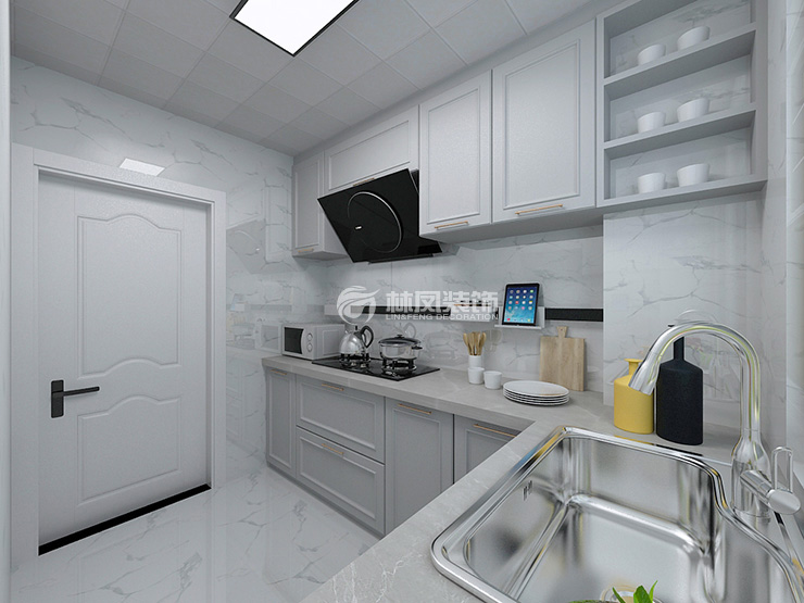 城建萬(wàn)科翡翠書院95平兩室兩廳林鳳裝飾的廚房櫥柜采用灰色吸塑柜門,搭配爵士白墻磚,干凈通透,由于將冰箱放在了門廳處,增加了廚房的整體收納空間。