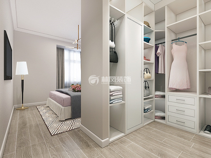美好奉璽臺108平三室兩廳現(xiàn)代輕奢風格林鳳裝飾的主臥飄窗保留,并設(shè)計了衣帽間,業(yè)主需要衣帽間,所以在主臥設(shè)計了一個小型衣帽間,即使這樣主臥同樣能放下一個一米八的雙人床。