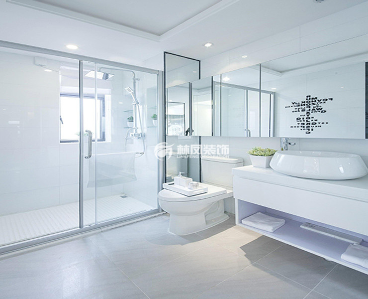 美好奉璽臺108平三室兩廳現(xiàn)代輕奢風格林鳳裝飾的衛(wèi)生間沒有改動,手盆馬桶淋浴正常設(shè)計擺放,洗衣機放置在廚房。