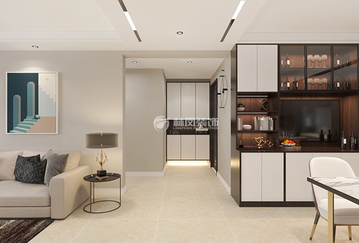中航城兩河流域140平三室兩廳現(xiàn)代風(fēng)格林鳳裝飾的客廳的空間吊頂造型比較簡單,沙發(fā)墻和電視墻兩邊做石膏板直線邊棚收邊,電視背景墻造型簡潔美觀,是以硬包和護(hù)墻板的結(jié)合,電視柜組合形式為主,沙發(fā)墻后期按照風(fēng)格的要求放置一組裝飾畫簡約大氣。