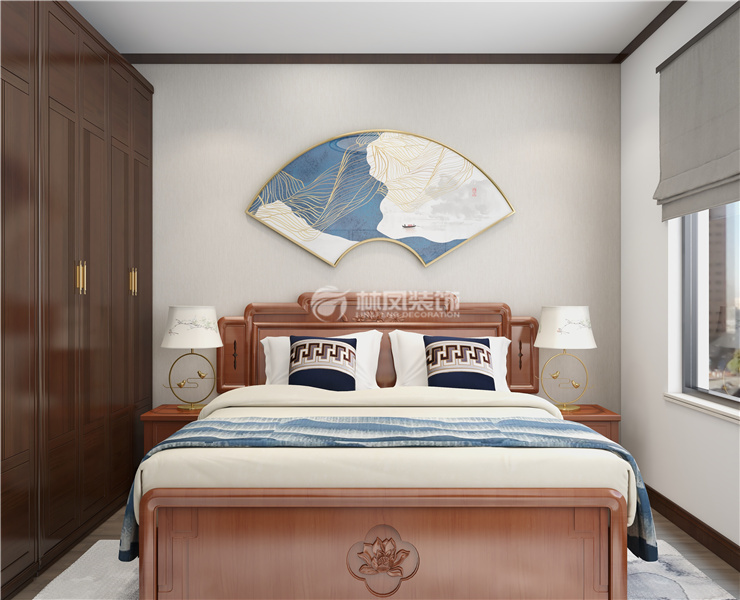 伊麗雅特灣140平兩室兩廳中式風(fēng)格林鳳裝飾的客廳主要以深顏色為主,背景墻采用深色木材與大理石搭配,給人對(duì)稱、沉穩(wěn)的感覺。沙發(fā)采用深色木材與淺色布料進(jìn)行搭配,凸顯業(yè)主對(duì)品質(zhì)的要求。