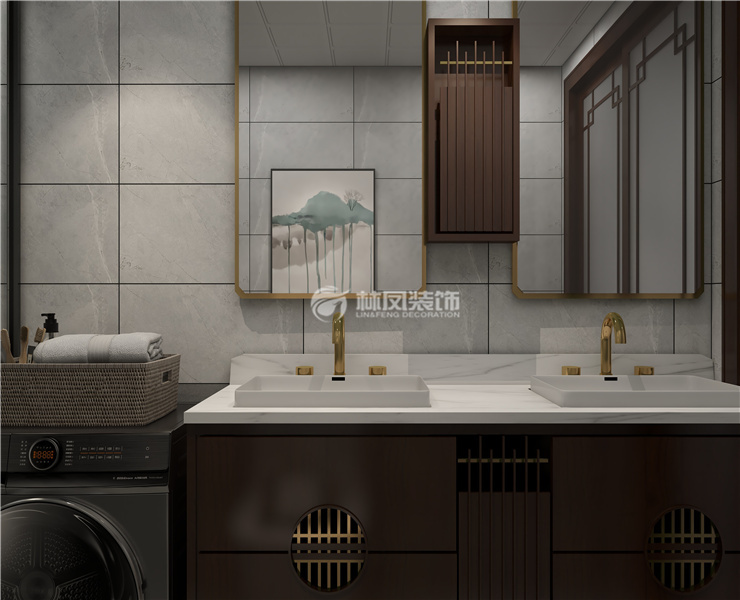 伊麗雅特灣140平兩室兩廳中式風(fēng)格林鳳裝飾的次衛(wèi)墻磚采用白、灰色搭配設(shè)計(jì)。主衛(wèi)墻磚采用淺灰,設(shè)置兩個(gè)洗手盆,即充分利用空間又為業(yè)主使用提供方便。