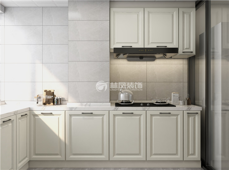廚房主要以白色帶造型的柜門搭配灰色瓷磚,對(duì)比色提亮了廚房的整體亮度,也使得空間更加干凈。