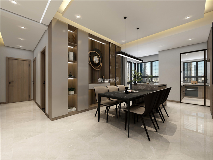 廚房為中廚封閉式空間,女主人在廚房隨意烹飪,也毫不懼怕油煙跑出,透明的玻璃門(mén),可以通過(guò)玻璃門(mén)可以看到孩子在外的活動(dòng)狀態(tài),家庭氛圍感濃郁。