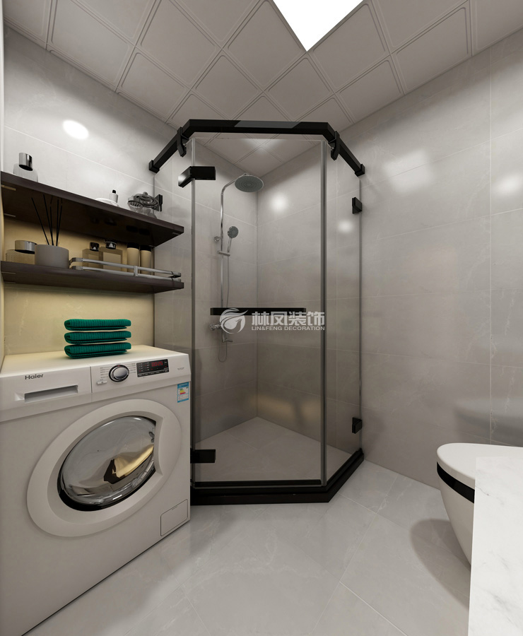 衛(wèi)生間采用淡灰色的墻地磚,提亮空間的亮度,同時(shí)暗素的紋理,使衛(wèi)生間空間低調(diào)而干凈整潔,淋浴房的設(shè)計(jì),優(yōu)秀了空間的整潔度,洗衣服空間增加了儲(chǔ)物功能,合理的利用了空余空間,增大利用率。