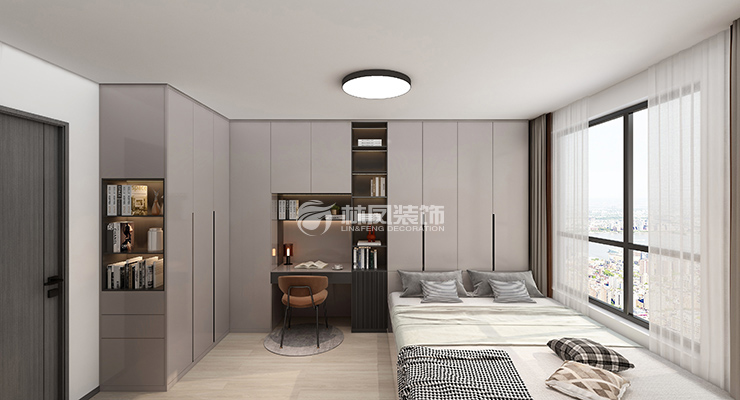 主臥空間較大,設(shè)計(jì)U型的衣帽間,增加儲(chǔ)物,主臥陽臺(tái),添置書柜,放置主人喜愛的手辦等,簡約大氣。