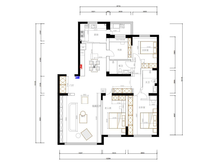 三室兩廳一廚兩衛(wèi),高層整體采用美式風(fēng)格,色調(diào)以深色為主,體現(xiàn)美式的居家感和溫馨感。