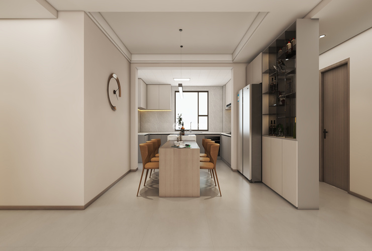 廚房說明:餐廳與廚房相連接,呈現(xiàn)出餐廳空間明亮寬大的效果,底柜設(shè)計表現(xiàn)簡約風(fēng)格?,F(xiàn)代風(fēng)餐廳設(shè)計旨在提供舒適、現(xiàn)代、實用的空間,同時注重環(huán)保和節(jié)能,利用色彩和材料營造出獨特的氛圍,滿足現(xiàn)代社會人們的生活需求,