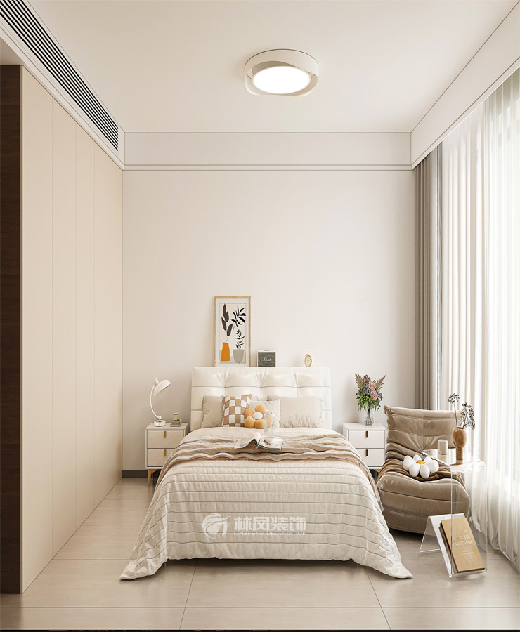 臥室說明:色彩的運(yùn)用在裝修手法上顯得尤為重要,我們將奶油色和奶茶暖色作為主調(diào),采用裝飾掛件增加色彩,不顯得單調(diào),讓人一進(jìn)入就有愉悅放松的感覺