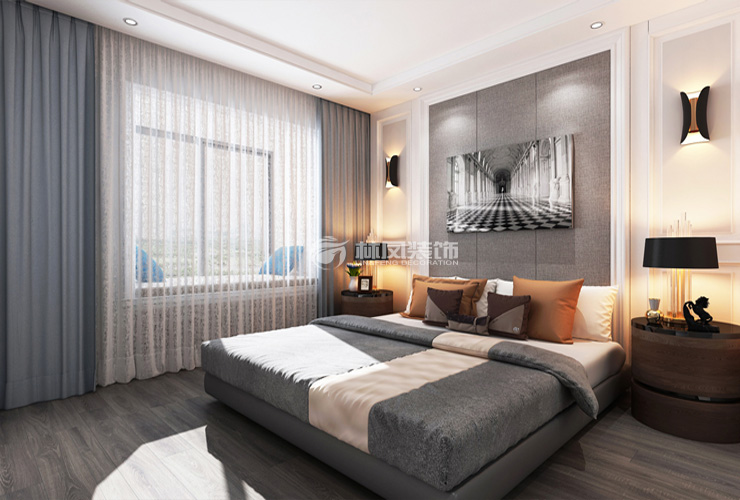 主臥室的色彩延續(xù)的客廳的顏色,地面采用灰色的地板,是本來(lái)過(guò)于硬朗的感覺(jué)變得柔和起來(lái),床頭背景墻則采用灰色的布藝硬包做裝飾,橙色的床品使本來(lái)過(guò)于平淡的空間鮮活起來(lái),使業(yè)主在休息之余能更好的放松心情。