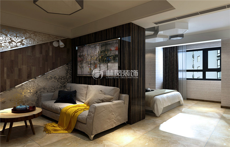 客廳算是一個(gè)起居室,一室一廳的房型沒(méi)有放置電視,這也造就了其自在、隨意的不羈生活方式,沒(méi)有太多造作的修飾與約束,客廳的地板上墻體現(xiàn)了現(xiàn)代人追求時(shí)尚的心態(tài),打破整個(gè)空間的寂靜讓人眼前為之一亮。