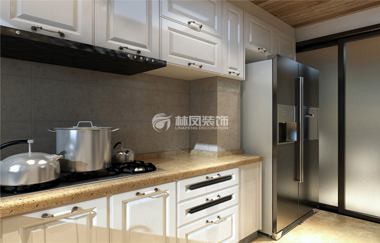 因?yàn)闄还襁x擇的是白色,所以設(shè)計(jì)廚房墻面的主題顏色以深色為主,這樣才能體現(xiàn)開(kāi)放式廚房的通透與顏色搭配,開(kāi)放式廚房盡最大可能的融入到了生活當(dāng)中。