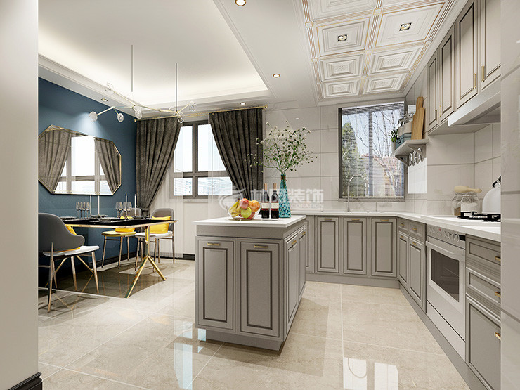 廚房是開敞式廚房,餐廳與廚房相連,中間設(shè)計(jì)了一個(gè)導(dǎo)臺,空間相較于封閉式廚房與餐廳,空間顯得寬敞大氣,也能匹配法式風(fēng)格。櫥柜的顏色以及造型與客廳統(tǒng)一,柜體上同樣鑲嵌金屬條。