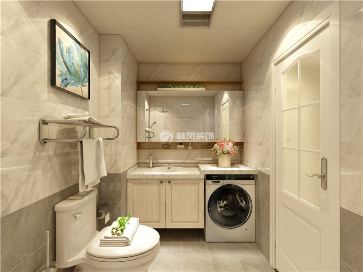墻面磚延續(xù)了客廳磚的理石質(zhì)感,采用下深上淺的顏色搭配,使空間顏色對比分明,浴室柜臺(tái)面做了一個(gè)延伸,有更多的平面空間擺放洗漱用品,增加了空間的利用率。