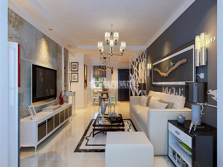 本案戶型客廳主要作用是滿足客戶生活起居,客廳沒有做過多的造型和裝飾,多以裝飾為主。電視墻搭配的是一款及鏡面材質(zhì)和壁紙石膏板三種元素為一體的背景墻。在沙發(fā)墻的左右兩側(cè)置辦一組照明吊燈,照明是一個照明兼裝飾的代表,造型不繁瑣。整體配飾溫馨舒適干干凈凈。整體吊頂是石膏角線和石膏板造型棚相結合。正好彌補了原始頂棚的不完美空間。