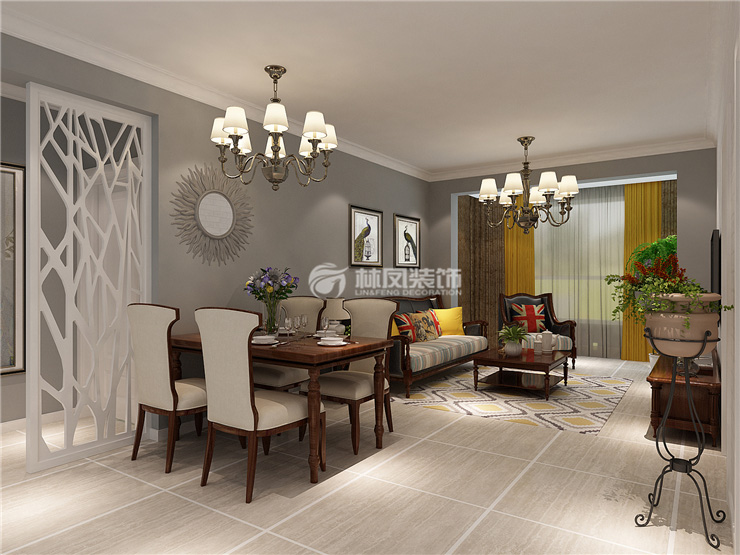 整體客廳空間以灰色色調(diào)為主,目的是襯托軟裝及家具的整體效果,原始背景墻采用白色的文化磚作為主要裝飾,簡潔個性有不失明亮,利用純實木的家具配以深藍色皮質(zhì)的沙發(fā),搭配上明黃色的窗簾布藝作為點綴色,突出來美式風格復古的特點,利用軟裝配色,使整體空間更加協(xié)調(diào)。