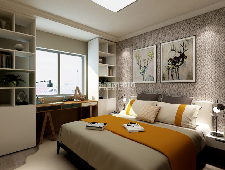 本案的主臥室設(shè)計(jì)上追求更實(shí)用,棚面采用簡潔的石膏線收邊設(shè)計(jì),主墻面是用淺咖啡的顏色與床飾品的黃色的搭配設(shè)計(jì)與客廳的整體顏色對接使得整個家居空間更溫馨。