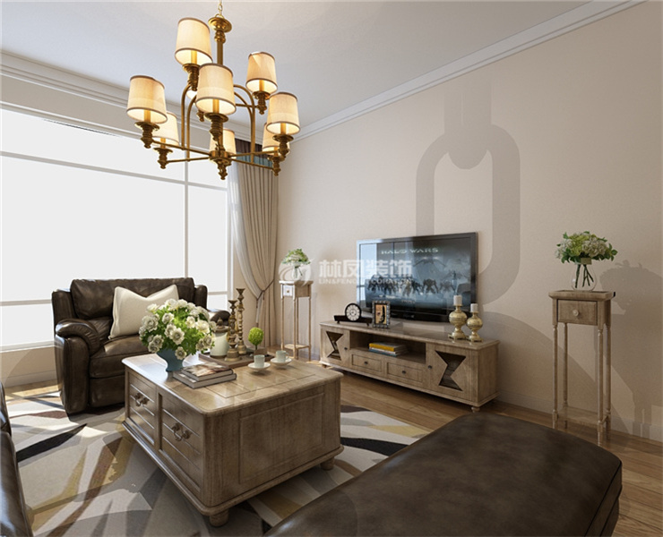 三室兩廳一廚兩衛(wèi),高層整體采用美式風(fēng)格,色調(diào)以深色為主,體現(xiàn)美式的居家感和溫馨感。