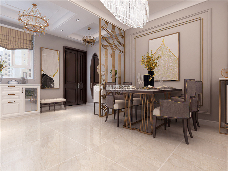 客廳家居將光融于景,即便不語也可心海如瀾。一幅抽象畫演繹了一場有關藝術的對話,通過“隱去”來引導“探知”,退而求進,隱而求知,默而求解,為此帶來一場視覺上的震撼。運用了美式轉角沙發(fā)搭配灰色背景墻,茶幾,電視柜和餐邊柜金屬線條映襯整體輕奢美式風格的主線。