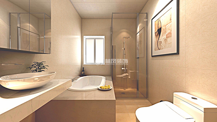 衛(wèi)生間主要以暖色系為主,大理石臺面與嵌入式浴缸加上淋浴房 ,功能齊全且美觀。