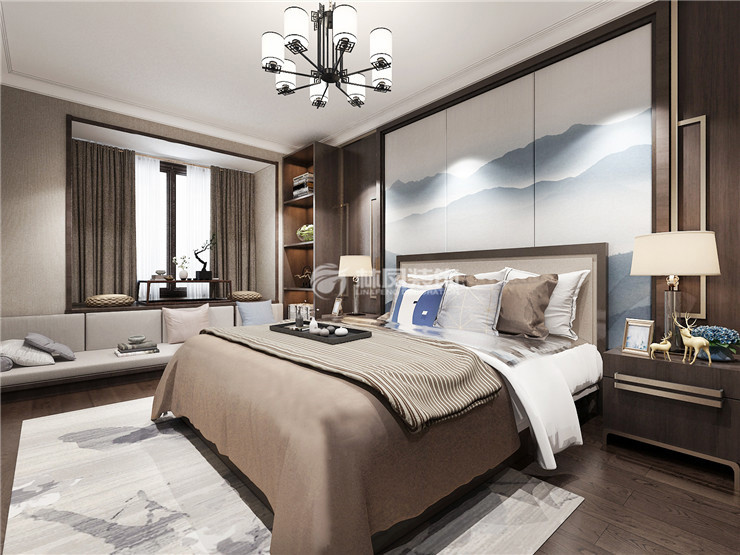 臥室同樣充滿了新中式元素,例如床頭背景墻和床榻等,沒有過多的裝飾性掛件等,整體顯得更穩(wěn)重,窗戶旁設計了錯級的書桌和矮飄窗??臻g感更強。