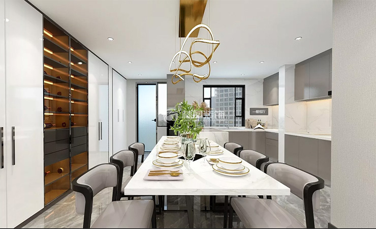 餐廳在一樓,作為除客廳以外最引人注意的空間,本次方案決定把餐廳空間做大,一整面墻做酒柜,使整個空間的品質(zhì)提升,理石材質(zhì)的餐桌和島臺讓空間顯得更加整潔大氣,餐桌上方的金屬材質(zhì)吊燈更加突顯輕奢風(fēng)格。