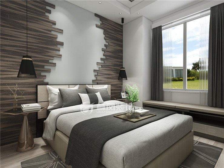 主臥室:在臥室方面我們極力想要營造出時尚與科技感,床頭背景畫采用極簡的黑白色進行色彩碰撞。用簡約的線條和虛光燈帶搭配出時尚感,使用大幅畫作線條體現(xiàn)出它的時尚與不同。