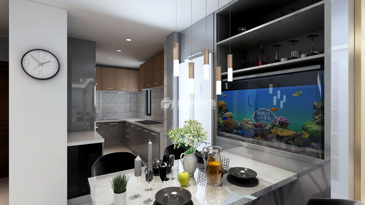 餐廳是女主人比較在意的地方,在餐桌的選擇上,考慮到符合整體風(fēng)格的同時(shí),也考慮到實(shí)用行,大理石臺面的餐桌既有高光澤度,又防燙、防油、防滑、防磕碰。餐椅則選用布藝和實(shí)木結(jié)合的材質(zhì),保證了就餐的舒適性,也與餐桌形成對比,更具設(shè)計(jì)性和觀賞性。餐廳設(shè)計(jì)了定制酒柜,將冰箱嵌入其中,更應(yīng)男房主的要求,設(shè)計(jì)了嵌入式魚缸,豐富了餐廳空間的同時(shí),增加了就餐的樂趣,可以說將空間利用發(fā)揮到了極致。