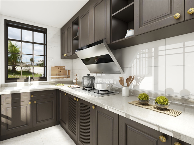廚房使用白色為墻面主體色調(diào),櫥柜選用實(shí)木材質(zhì)彰顯主人典雅尊貴的氣質(zhì)。