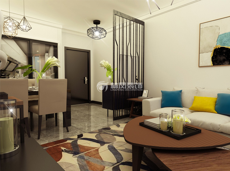 萬錦香樟樹80平2居室現(xiàn)代風(fēng)格林鳳裝飾的客廳整體色調(diào)以黑白灰為主,軟裝進(jìn)行暖色與冷色的碰撞,玄關(guān)隔斷,燈具等形態(tài)都以直線線條拼接的形態(tài)出現(xiàn),使整體空間感覺簡單大方。