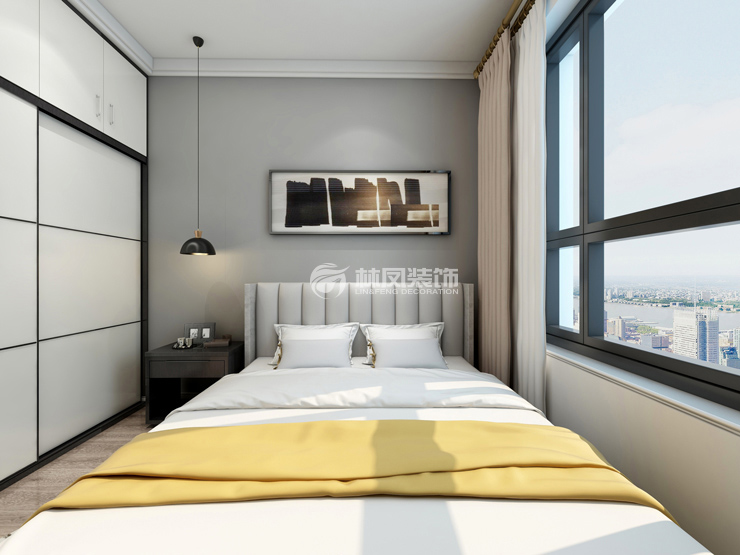 龍湖西府原著85平2居室現代風格林鳳裝飾的臥室空間布藝的床頭靠背,增加了舒適感,訂制的衣柜增加了儲物功能,黑白灰的感覺延伸到臥室,但是地面則采用暖色系的地板,增加了溫馨的感覺。