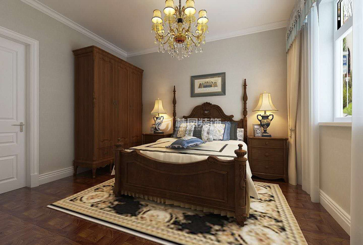 格林觀塘168平美式裝修風(fēng)格林鳳裝飾的主臥的空間特別,墻面搭配了一些軟裝掛畫的配飾,后期如果有結(jié)婚或者藝術(shù)照片可以掛在床頭。
