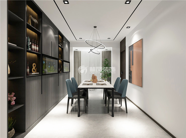 保利達(dá)江灣城170平4居室現(xiàn)代風(fēng)格林鳳裝飾的餐廳做了個(gè)餐邊柜,魚缸與餐邊柜做一起,讓家里的生意越來越好,財(cái)源廣進(jìn)