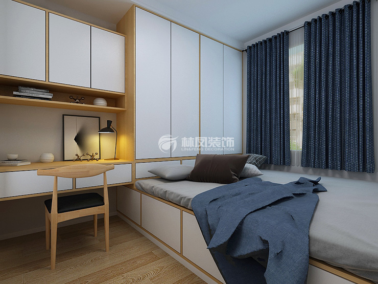 華強(qiáng)城105平2居室北歐風(fēng)格林鳳裝飾的臥室整體墻面碰面都采用白色乳膠漆,地面和家具的色彩采用原木色,柜體也采用原木色和白色混色,整體色系溫暖,床頭采用布藝床頭,舒適柔軟,床頭的組合掛畫(huà)增加我內(nèi)北歐風(fēng)格的元素,讓整體空間給人一種想要入睡的感覺(jué)。