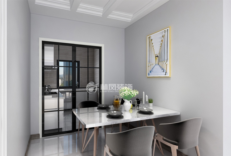 紫提東郡78平2居室現代風格林鳳裝飾的餐廳與廚房之間距離非常近空間不是特別大,透明的推拉門使得總體空間更寬敞一些,不會因為空間小而有緊迫感。