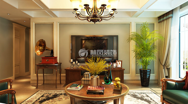 金地檀府114平4居室美式風(fēng)格林鳳裝飾的客廳的電視背景墻是實(shí)木護(hù)墻板,40mm壓線。墻板、踢腳線與門口同色,交圈感很好。木本綠植和黑膠碟唱機(jī)增加了客廳的復(fù)古感和自然感。沙發(fā)是我特意在林鳳合作的品牌中為業(yè)主挑選的,這套沙發(fā)讓客廳空間色彩和層次更豐富了。